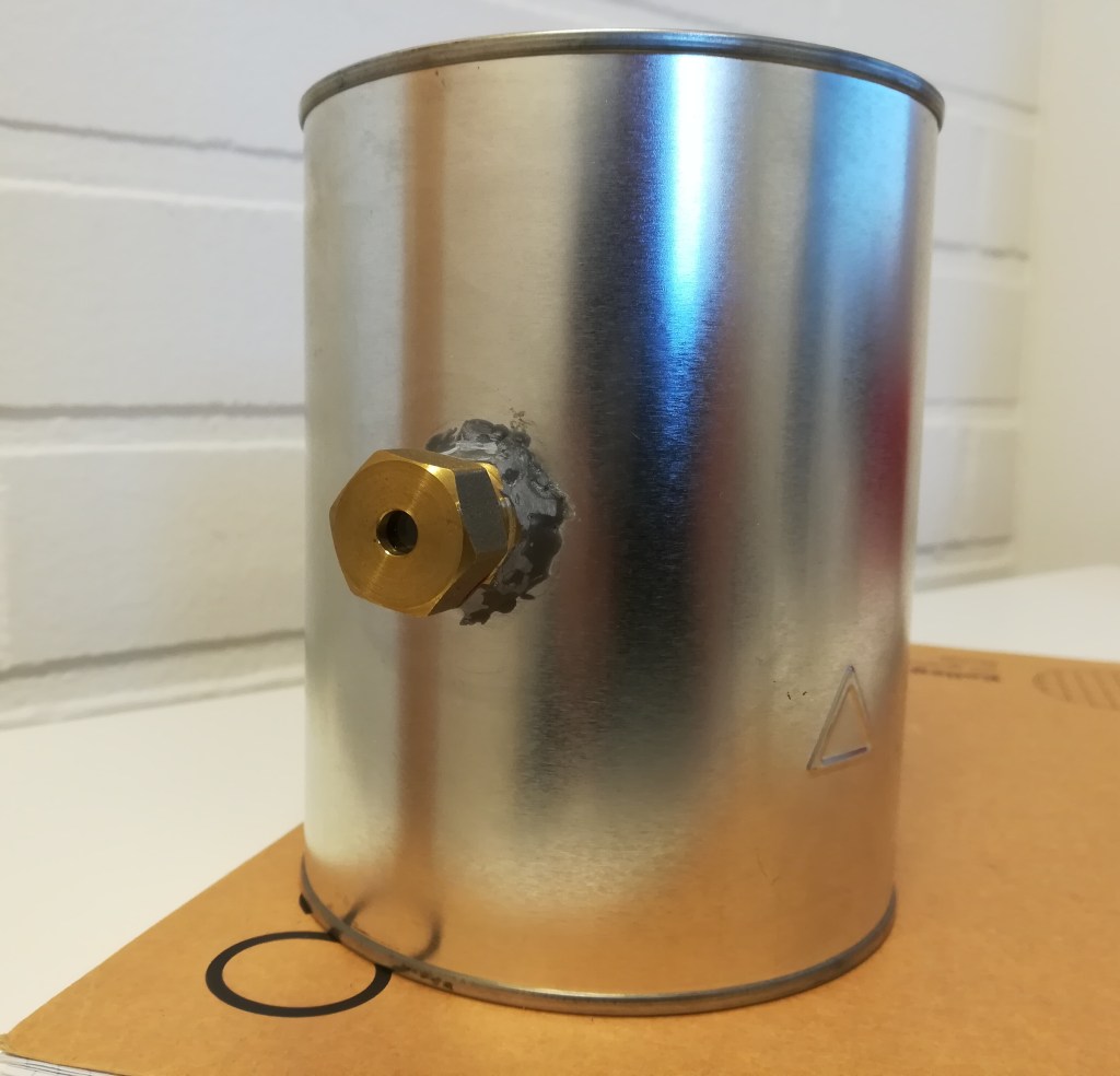 The container itself is a one liter paint can. Window ports are made of typical home pipe fittings, adapters and plugs. The window glass is uncoated 15 mm diameter circular glass from Edmund Optics (part # 43-891). I did some leak tests for the ports ports and they survived 3,5 bar pressure without leaking. I fixed the ports to the container wall with Plastic Padding.
